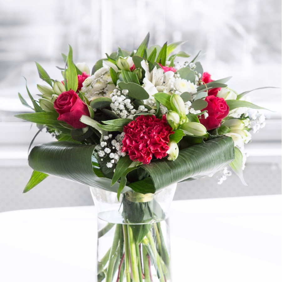 Discover the beauty and uniqueness of our exquisite bouquet, meticulously crafted to inspire creativity and imagination. This stunning arrangement features a harmonious blend of vibrant red roses, delicate white chrysanthemums, playful carnations, and airy gypsophila, all gracefully complemented by white alstroemeria and lush aspidistra leaves.